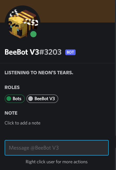 BeeBot is a very interesting tale to tell. BeeBot's journey begins with myself running a Minecraft server, that was updating to version 1.15 of the game - this is the version where bees were introduced, and I liked this. Our head moderator did not. So when they went on a week break, they told me not to spawn any bees. BeeBot was functional by the end of the week.